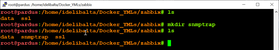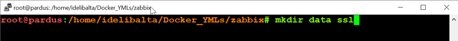 Öncelikle docker üzerinde postgres hizmet alacağımız için volume olarak kullanmak amacı ile iki tane klasör oluşturuyorum. Bunlar zabbix db datası için kullanılacak data diğeri de nginx web server tarafında kullanacağımız ssl klasörü.
