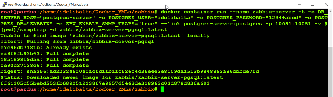 docker container run --name zabbix-server -t -e DB_SERVER_HOST="postgres-server" -e POSTGRES_USER="idelibalta" -e POSTGRES_PASSWORD="1234+abcd" -e POSTGRES_DB="ZABBIX" -e ZBX_ENABLE_SNMP_TRAPS="true" --link postgres-server:postgres -p 10051:10051 -v $(pwd)/snmptrap -d zabbix/zabbix-server-pgsql:latest