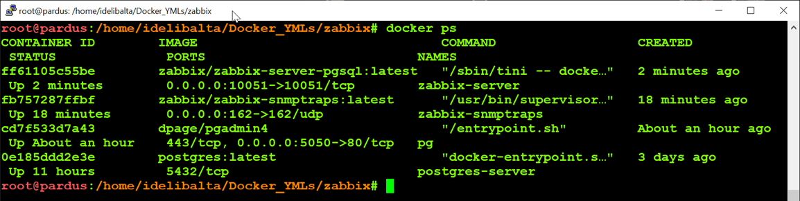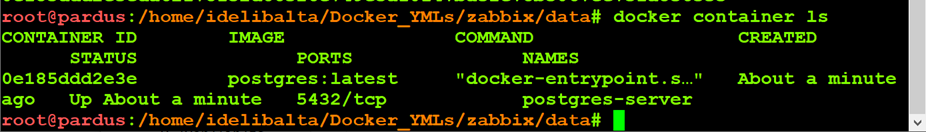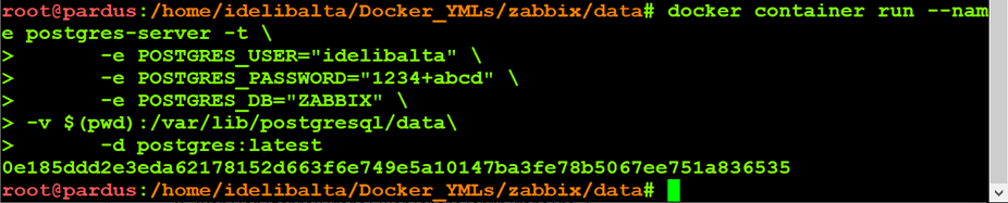 docker container run --name postgres-server -t -e POSTGRES_USER="idelibalta" -e POSTGRES_PASSWORD="1234+abcd" -e POSTGRES_DB="ZABBIX" -v $(pwd):/var/lib/postgresql/data\ -d postgres:latest