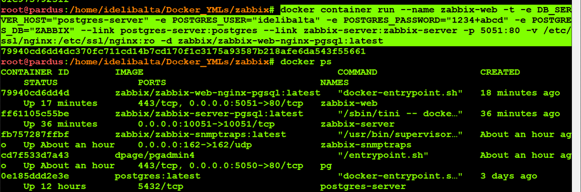 docker container run --name zabbix-web -t -e DB_SERVER_HOST="postgres-server" -e POSTGRES_USER="idelibalta" -e POSTGRES_PASSWORD="1234+abcd" -e POSTGRES_DB="ZABBIX" --link postgres-server:postgres --link zabbix-server:zabbix-server -p 5051:80 -v /etc/ssl/nginx:/etc/ssl/nginx:ro -d zabbix/zabbix-web-nginx-pgsql:latest