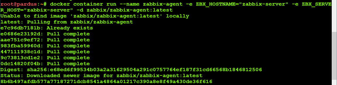 docker container run --name zabbix-agent -e ZBX_HOSTNAME="zabbix-server" -e ZBX_SERVER_HOST="zabbix-server" -d zabbix/zabbix-agent:latest