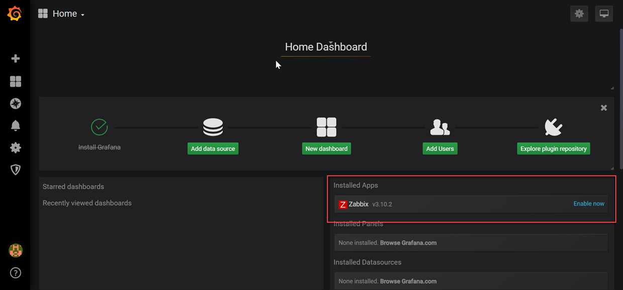 Grafana web panel üzerinde Installed Apps bölümünde Zabbix in bulunduğunu ve sadece Enable now beklediğini söyleyebiliriz.