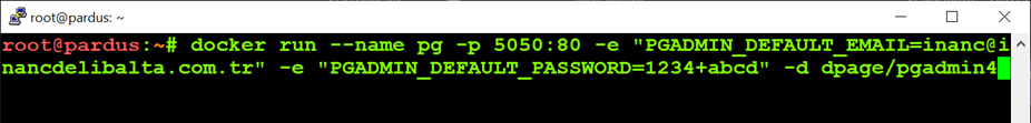 docker container run --name pg -p 5050:80 -e "PGADMIN_DEFAULT_EMAIL=inanc@inancdelibalta.com.tr" -e "PGADMIN_DEFAULT_PASSWORD=1234+abcd" -d dpage/pgadmin4