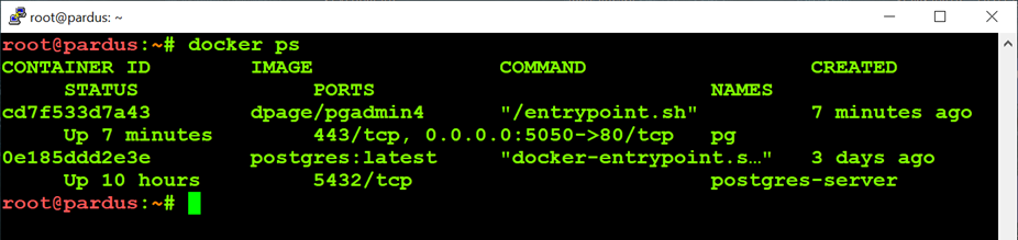 Komutu ile postgres container durumuna bakıyorum. Şu an aktif ve çalışıyor durumda.