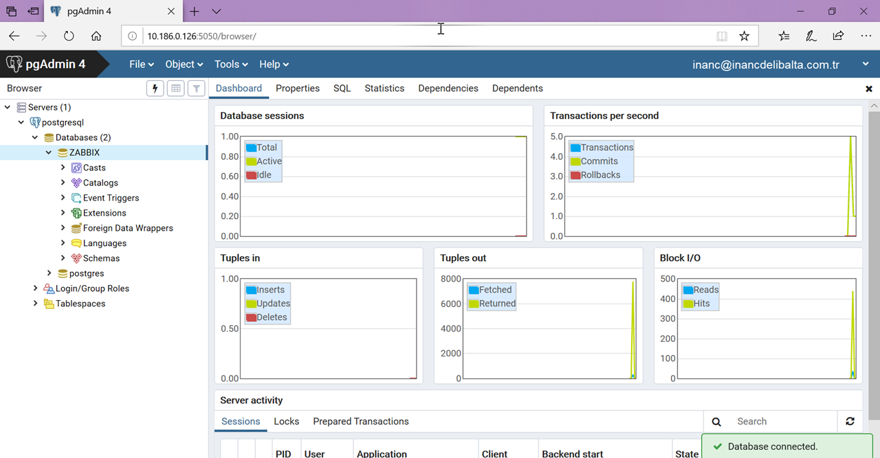 Son kontrol de pgadmin ile postgres tarafına bağlandığımızı ve ZABBIX veritabanının aktif olduğunu görüyoruz.